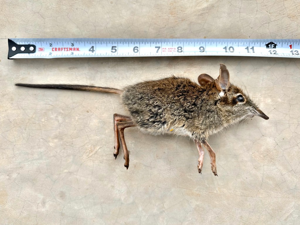 Four-toed elephant shrew, brought to us by our cat Little Bit. Unfortunately she dispatched it before bringing it in, so it was not much fun to play with. March 1, 2023.