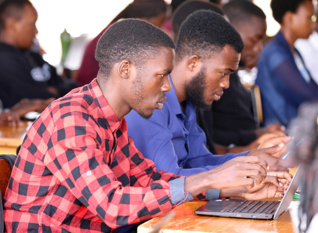 A RICA 3rd Year student presents her poster describing her capstone project to a faculty review team. 3rd Year students have completed one term of their internship with a host company in Rwanda. They will spend one more term in their internship placement before graduation in August. April 4, 2023.