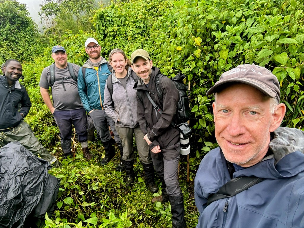 We were able to spend time with our family during Thanksgiving week. On Thanksgiving Day, some of us went on a mountain gorilla trek in Volcanoes National Park. From left to right is Emmanuel (our guide), nephew Brad Carpenter, son Ben Ferguson, niece Chelsea Carpenter, son Ryan Ferguson and me. November 23, 2023.