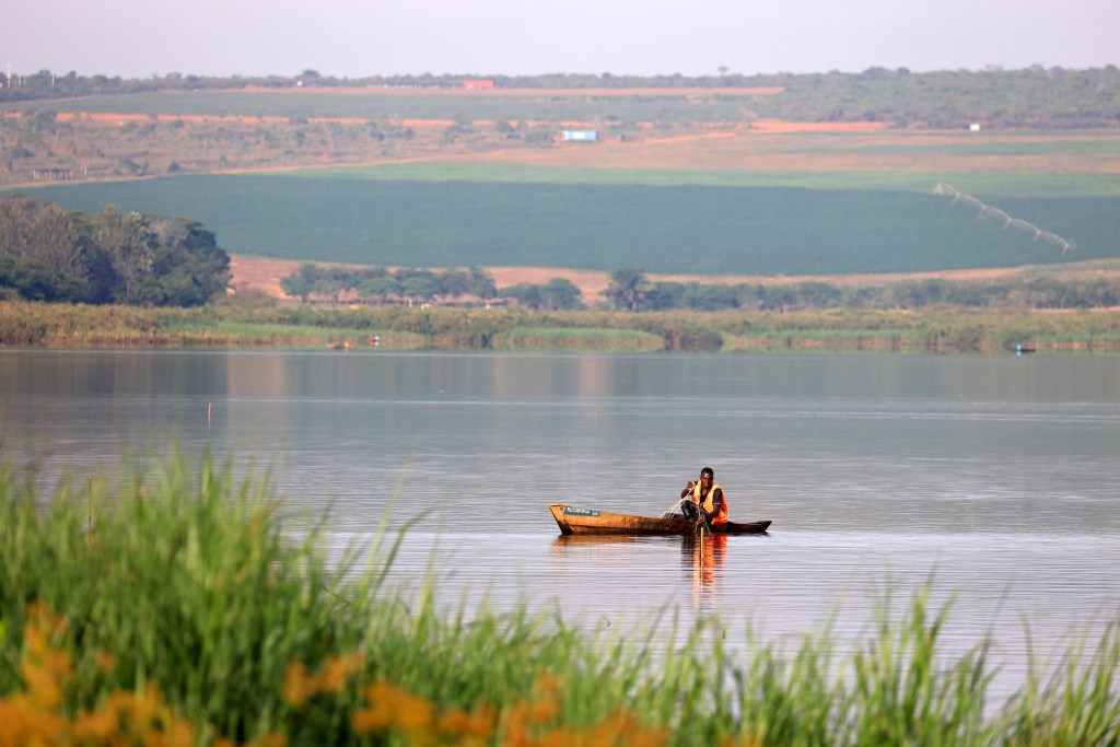 Fisherman on Lake Kilimbi. A center-pivot irrigated field of maize of the Rwanda Institute for Conservation Agriculture (RICA) is in the background. October 14, 2023.
