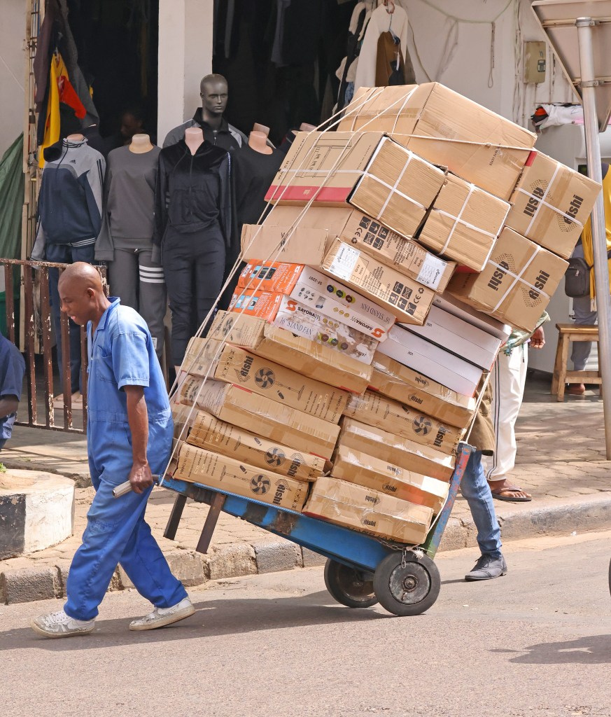 Shopkeeper adjusting his display of goods, primarily for visitors, as his shop is in the tourist-oriented car-free market, central Kigali. May 22, 2024.