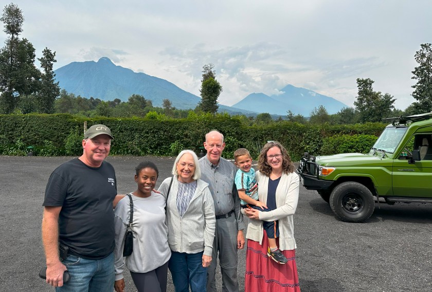 Glen Slater, Adda Ireba, Teresa and Richard, Ian and Chelsea Carpenter, with Virunga Mountains in background. September 19, 2024.