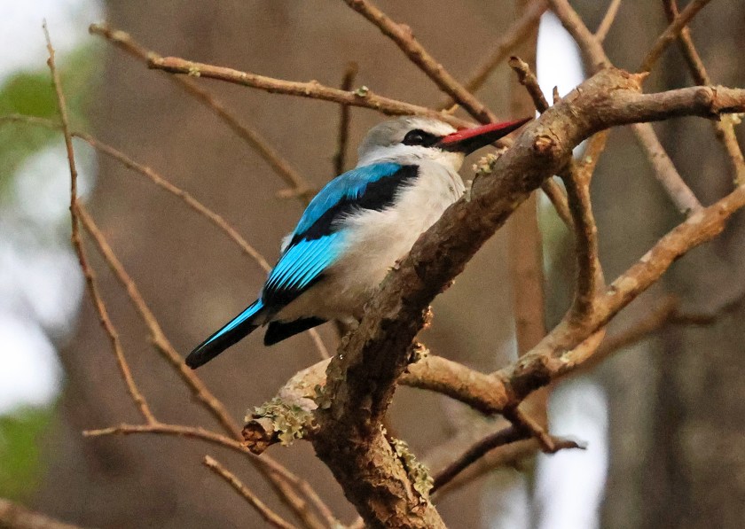 A Woodland Kingfisher perched on a light cable near Kilimbi House, the RICA Vice Chancellor’s residence. A pair of Kingfishers established a nest in a tree in front of Kilimbi House. January 1, 2024.