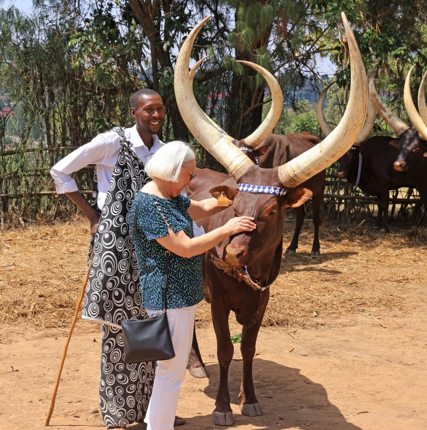 Teresa with Inyambo cow and herdsman. King’s Palace Museum, Nyanza. September 21, 2025.