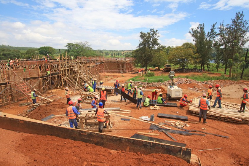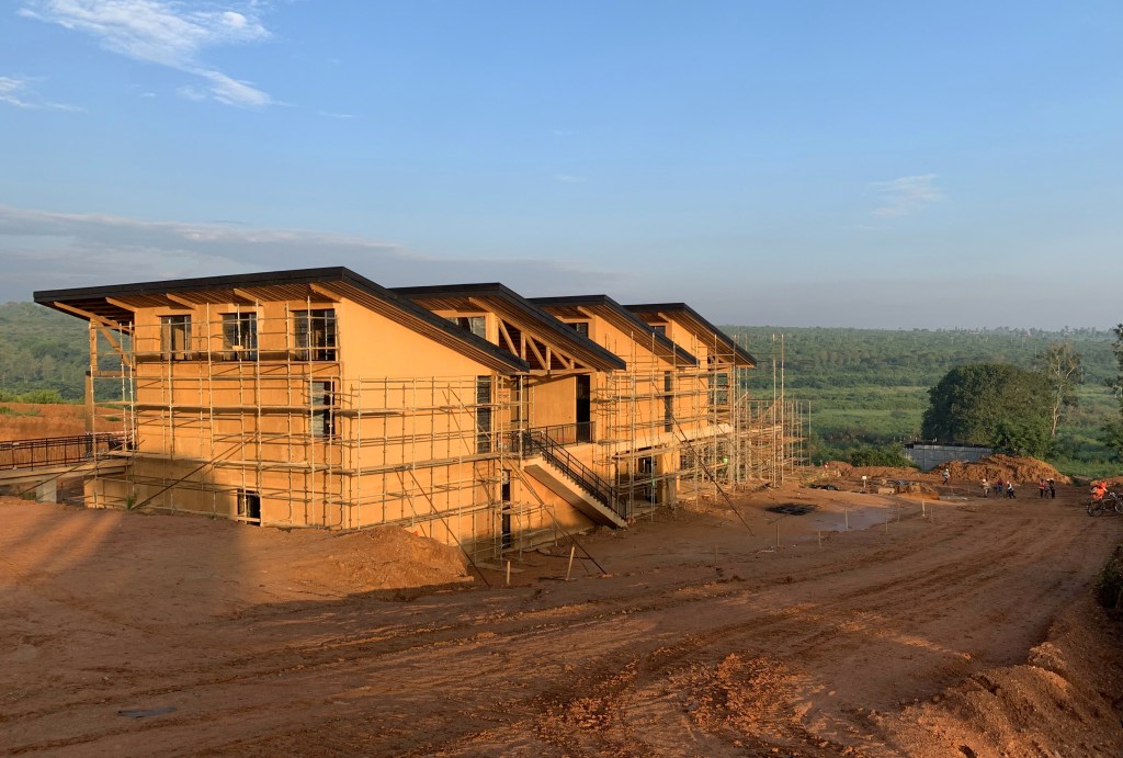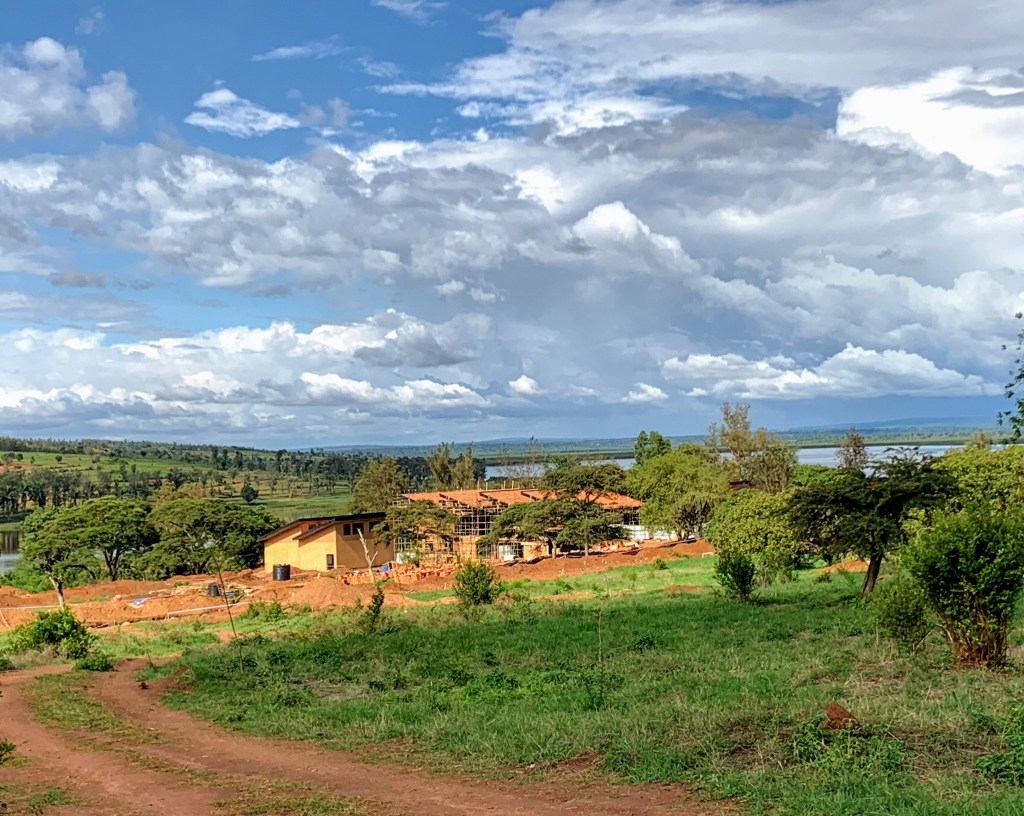 View from the faculty housing area towards the First Year Farm housing, with on-going construction. Lake Kilimbi is in the background. September 17, 2019.