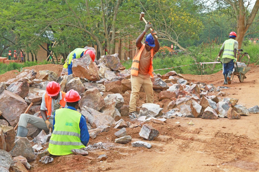 Breaking stones for construction of drainage way dams, RICA campus, April 7, 2019.