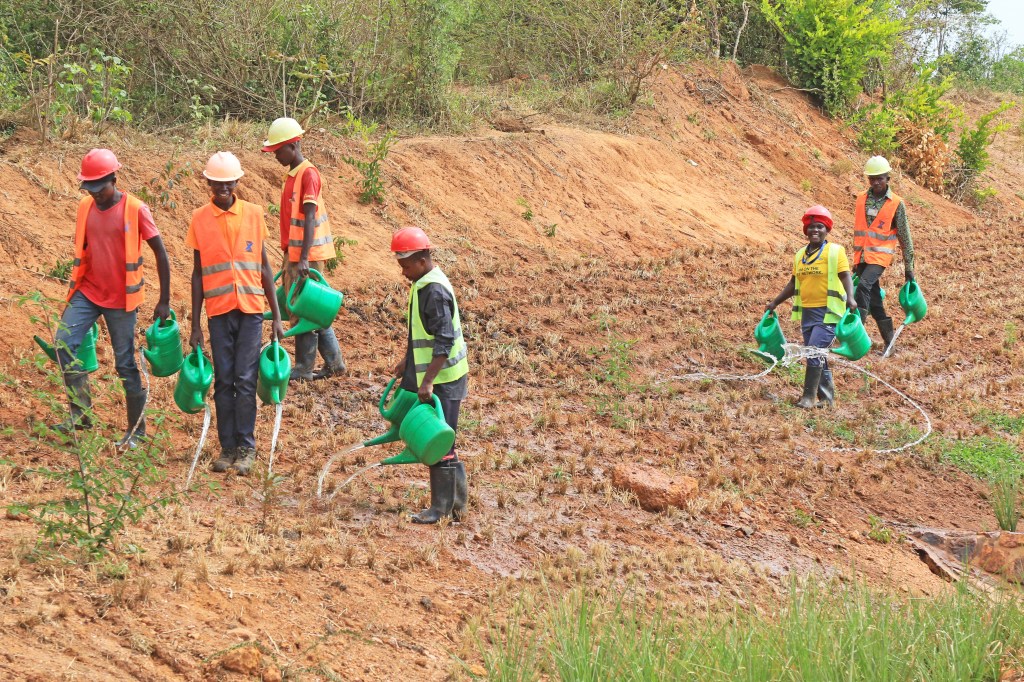 RICA campus, main entrance road, April 7, 2019. Plants along drainage swales and roadside banks are propagated on site, then planted by hand.