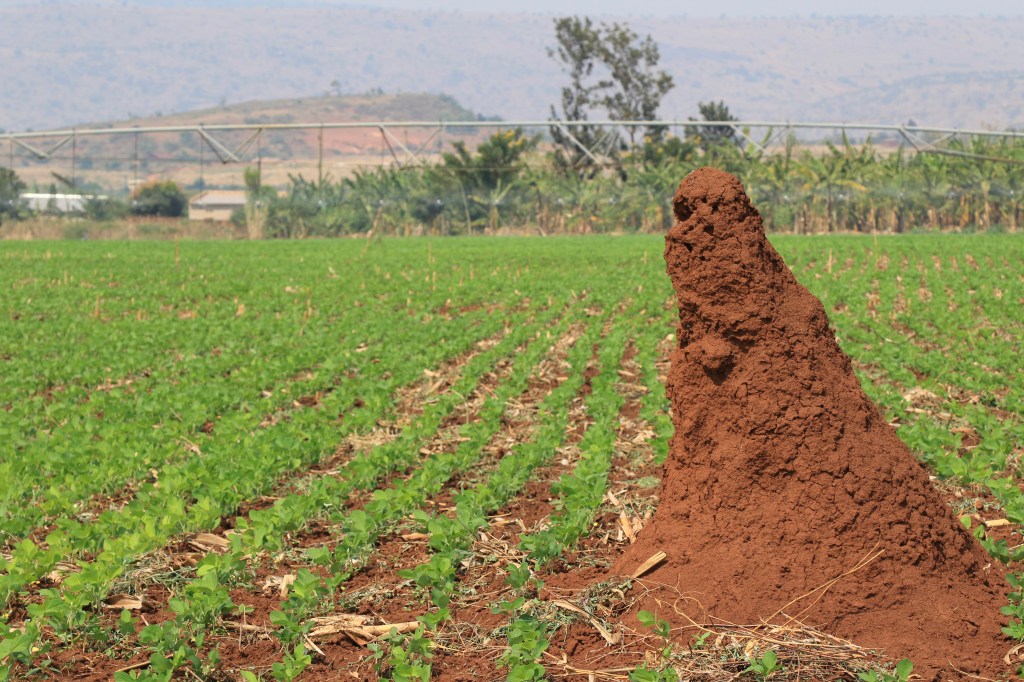 Termite mound in soybean field, Nasho Irrigation Project, July 26, 2019. Termites can rapidly break down crop residues, and weaken stalks of mature plants prior to harvest.