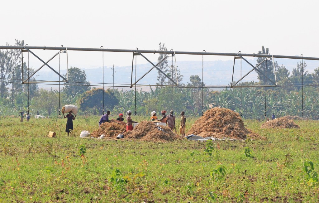 Surveying recently planted soybean, Nasho Irrigation Project, July 26, 2019. Dr. Magnifique Nzaramba on left, Dr. Kofi Boa on right. Soybeans are hand-planted in rows, watered with a center pivot irrigation system. There are 34 farmer’s fields under this pivot. This farmer has also hand weeded in the last two days.