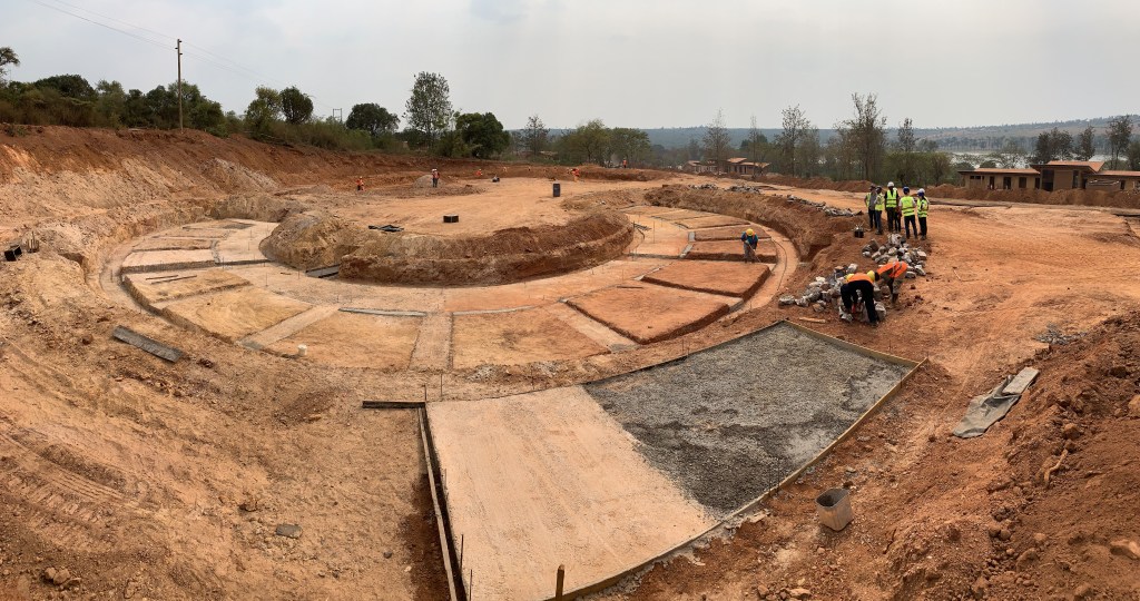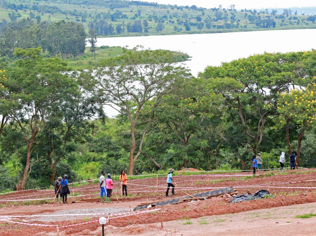 Rwanda Institute for Conservation Agriculture (RICA) campus under construction. View across Lake Kilimbi from the north shore. July 18, 2019.
