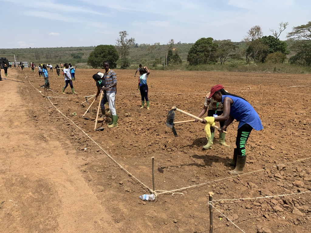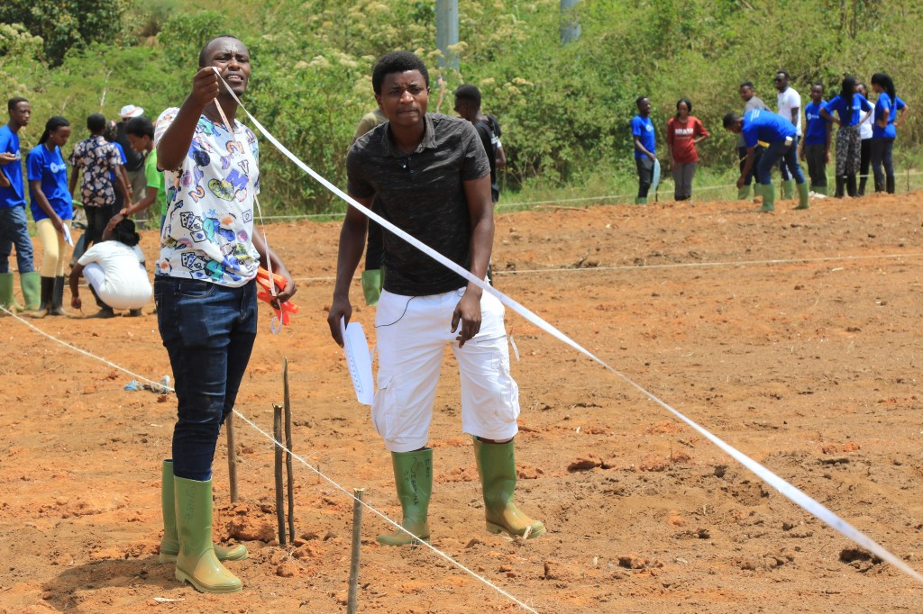 RICA students now are able to begin using land around their First Year Farm houses for crop production in their Practical Farming course. Here students are delineating boundaries for what will become their drip-irrigated production area adjacent to Ihema House. January 10, 2020.