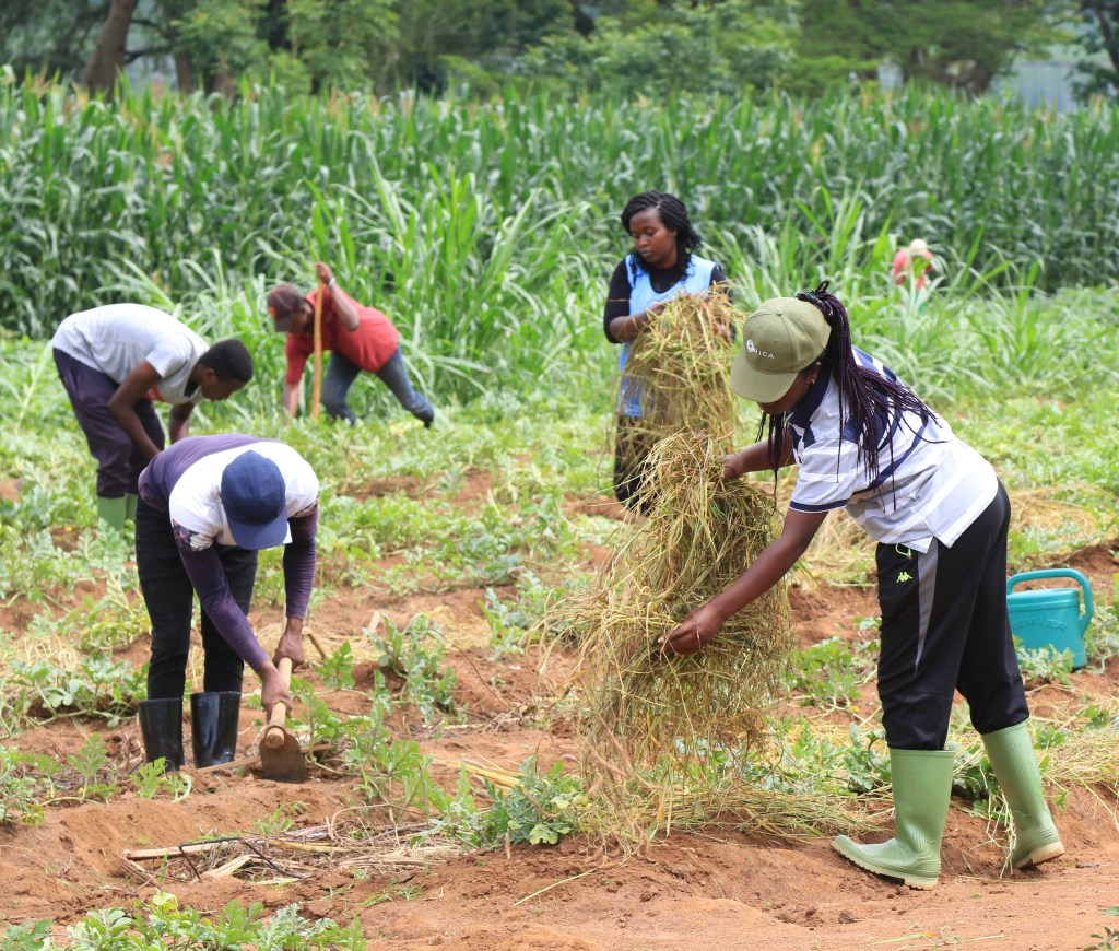 As part of their Practical Farming course, students in their first year spend several hours a week in the field. This first term students have been growing amaranth, watermelon, maize and French beans. Here students are weeding, fertilizing and mulching watermelon vines. December 6, 2019.